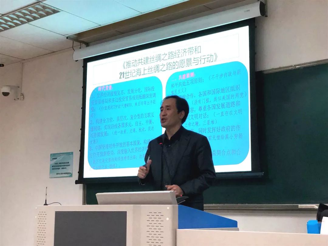 老师首先以《推动共建丝绸之路经济带和21世纪海上丝绸之路的愿景与行动》为材料,为我们讲解了“一带一路”的时代背景与共建原则,提出了大国应有小心眼的见解。然后介绍了以多赢战略,惠及所有参与者为目标,以对全球治理模式与平台的补充与完善为现实成就,以从利益共同体,责任共同体到命运共同体为未来期许的多角度政策研读。紧接着老师又强调了“一带一路”与“马歇尔计划”的不同,论证了我国“一带一路”战略是为了推动全球经济发展,建设全球治理体系而提出的。最后老师又以《我不是药神》和《至暗时刻》为例子,生动形象的为大家讲解了全球经济一体化以及离岸平衡手的相关知识。