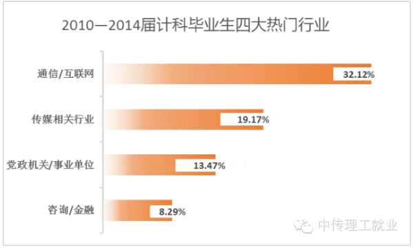 计科毕业生就业最为集中的是通信/互联网企业,也就是说干与本专业相关工作的人还是最多的,而前往传媒相关行业的人也不少。其他像党政机关/事业单位和金融行业则是各专业毕业生都很集中的热门行业。