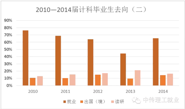 纵观近五年计科毕业生去向数据,就业仍然是多数人的选择,虽然每一年的比例有变化,在40%到75%之间浮动,但在三大去向中就业一直占据首位。选择就业,考研和出国(境)的人数排序未变,但少数人选择了其他的去向,如上本校的二学位和志愿参军。