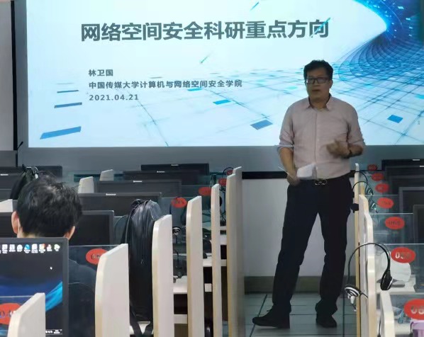 第二部分,学院林卫国经理以“网络空间安全科研未来的重点方向”为主题,从两个层面上介绍了网络空间安全的研究内容、面临的挑战、解决问题的理论基础以及关键技术。在讲座中林经理回顾了学院网络空间安全本硕专业的招生历史以及毕业生分配去向,总结了学院在网络空间安全领域获得的理论研究和实践成果,并以此为基础提出了建设两个网络安全平台的未来规划。规划中的两个网络安全平台,一是网络系统安全平台,二是网络内容安全平台。为了鼓励和支持教职员工积极参与平台建设,林经理还代表学院提出了一系列学院激励政策。