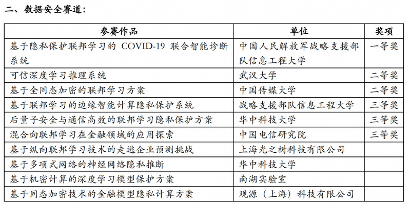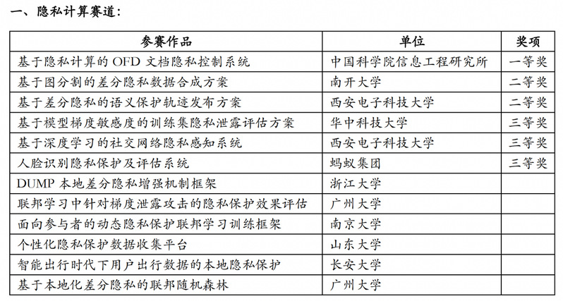赛事自2022年3月启动以来,吸引了包括浙江大学、南京大学等C9联盟高校,武汉大学、华中科技大学、南开大学、山东大学、西安电子科技大学等知名高校,以及中科院信工所、中国电信研究院、蚂蚁集团等科研机构的广泛关注和积极参与。经过初赛选拔,两大赛道分别有12个(隐私计算)、11个(数据安全)作品进入复赛。在复赛的激烈角逐中,最终分别评出一等奖1项、二等奖2项、三等奖3项。