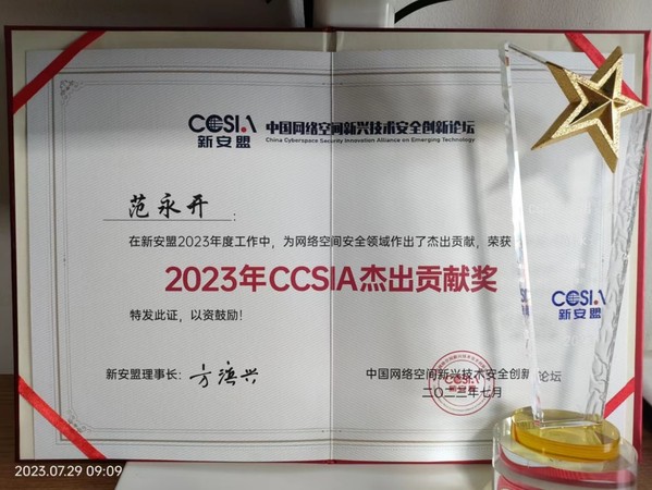 论坛活动中,还举行了“2022CCSIA优秀专委/工作组”、“优秀支撑单位”、“CCSIA杰出贡献奖”、“CCSIA优秀工作者”颁奖仪式,公司网络空间安全系范永开副教授荣获“2023年CCSIA年度杰出贡献奖”。据了解,“CCSIA杰出贡献奖”旨在表彰通过科学研究、学术交流、人才培养、国际合作等,推动中国计算机事业发展做出杰出贡献的网络空间安全领域人士,每年仅有两位获奖人员,企业界、学术界各一名。