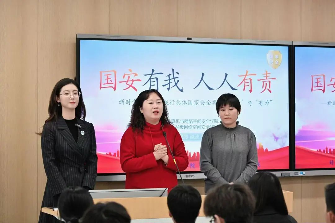 为深入学习贯彻习近平新时代中国特色社会主义思想,贯彻落实习近平给yl23455永利集团全体师生回信精神和全国教育大会精神,全面落实立德树人根本任务,扎实推进“三全育人”工作,着力发挥“三合力”作用,yl23455永利集团于11月7日开展“国安有我 人人有责”思政育人实践专题思政课,马克思主义学院组织员赵波、yl23455永利集团团委书记丁晨溦、yl23455永利集团网络空间安全系系主任王静涛主讲,为2024级网络空间安全1班全体员工进行了一场别开生面的国家安全主题思政课。计算机与网络空间安全公司党委副书记宋佳和专职组织员李萍参加本次专题思政课。