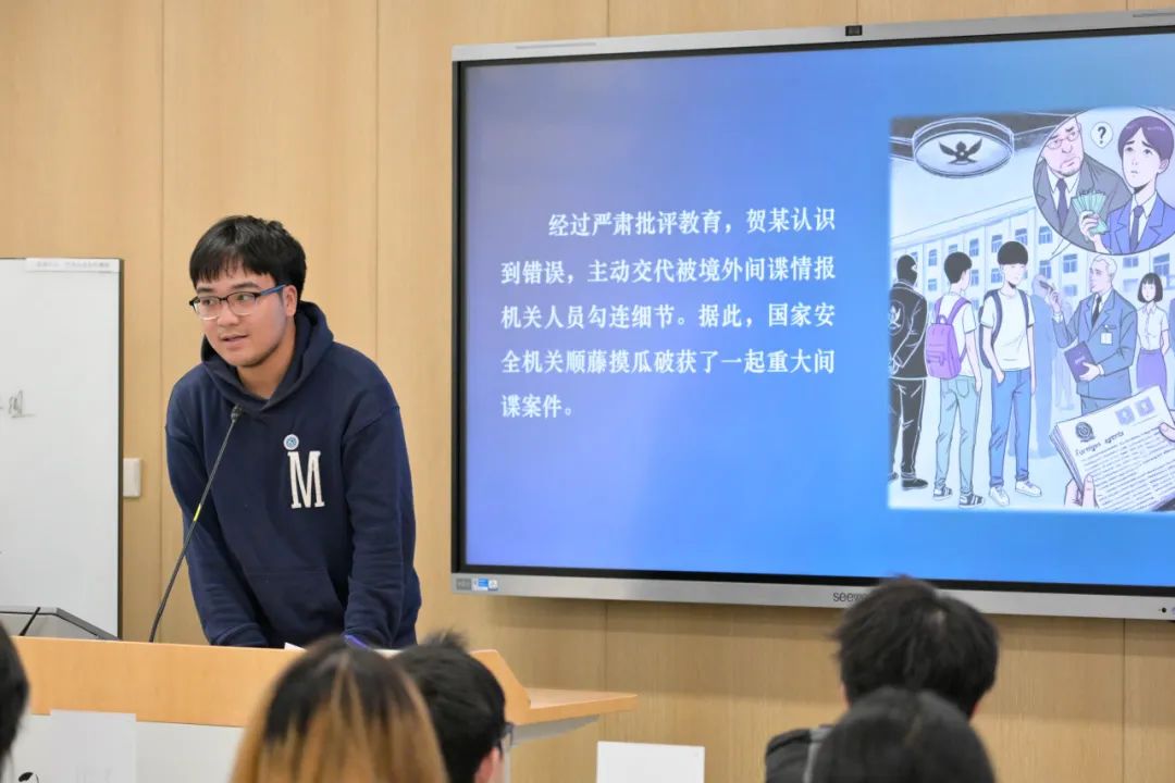 周为聪同学分享了对贺某事件的评述。他认为,这起事件不仅揭示了个人为了一己私利可以无视国家安全的严重性,也引发了我们对国家安全知识的深刻反思。这起事件也提醒我们,国家安全是每一个人的责任和义务,不论是个人或者国家都应该敲响国家安全的警钟。