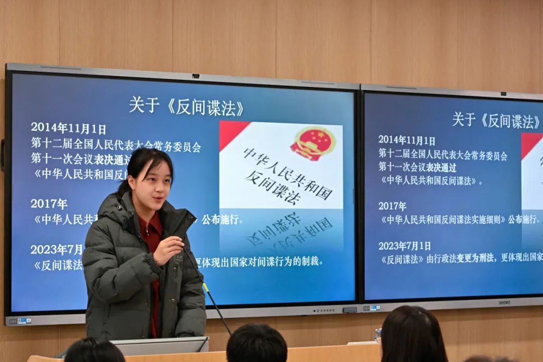 刘心悦同学主持该环节,为同学们介绍了《反间谍法》,并展示了王某某与贺某两个侵害国家安全的案例,供同学们认识与思考。