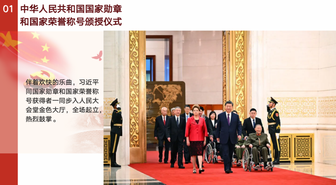 9月29日上午10时,中华人民共和国国家勋章和国家荣誉称号颁授仪式在人民大会堂隆重举行。中共中央总书记、国家主席、中央军委主席习近平向国家勋章和国家荣誉称号获得者分别授予“共和国勋章”“友谊勋章”和国家荣誉称号奖章。