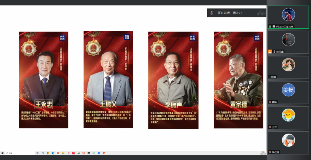 为学习榜样精神,10月30日晚,2023级硕士生党支部于线上开展了“国之脊梁,勋章之光”主题党课学习会。本次会议由组织委员何守力同志主持,共计18名员工党员参加。