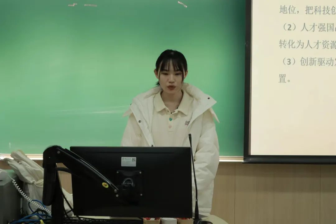 党员龚雨菲首先为同学们讲解了中国共产党在新时代背景下实施的科教兴国战略、人才强国战略和创新驱动发展战略。她强调,科教兴国是国家发展的根本方针,教育是提升国民素质和国家竞争力的基础,科技创新则是推动经济转型和社会进步的重要动力。龚雨菲指出,人才是实现国家长远发展的核心资源,必须树立“人才是第一资源”的理念,通过培养和引进高层次人才,推动国家由人口大国向人才强国转变。她呼吁同学们要积极参与科技创新和教育改革,勇于担当,发挥自己的创造力和影响力,为实现中华民族的伟大复兴和建设社会主义现代化强国贡献智慧与力量。