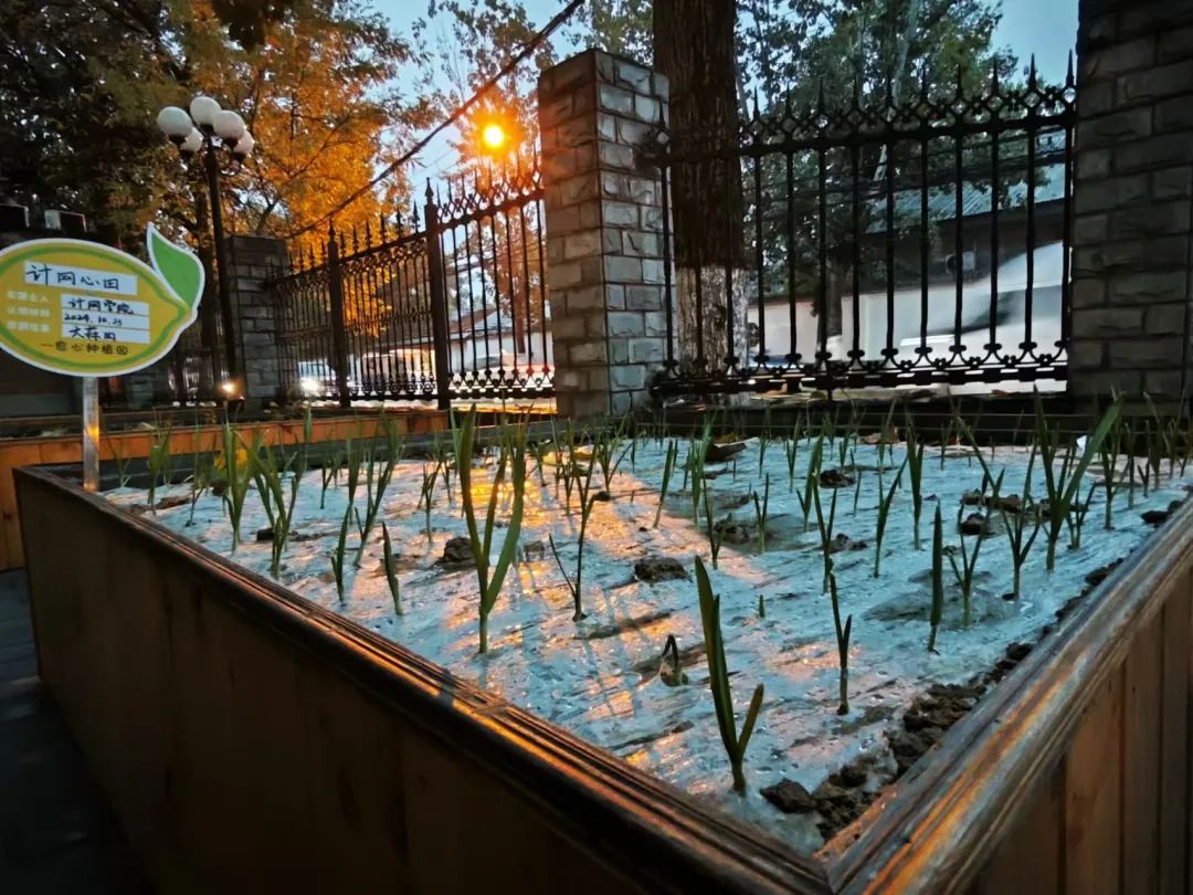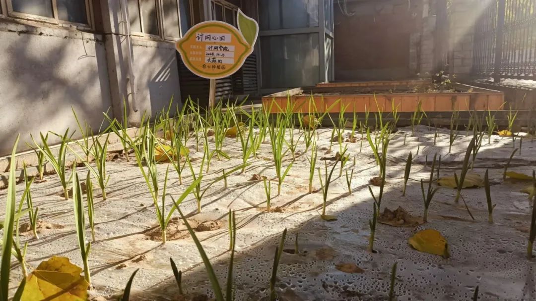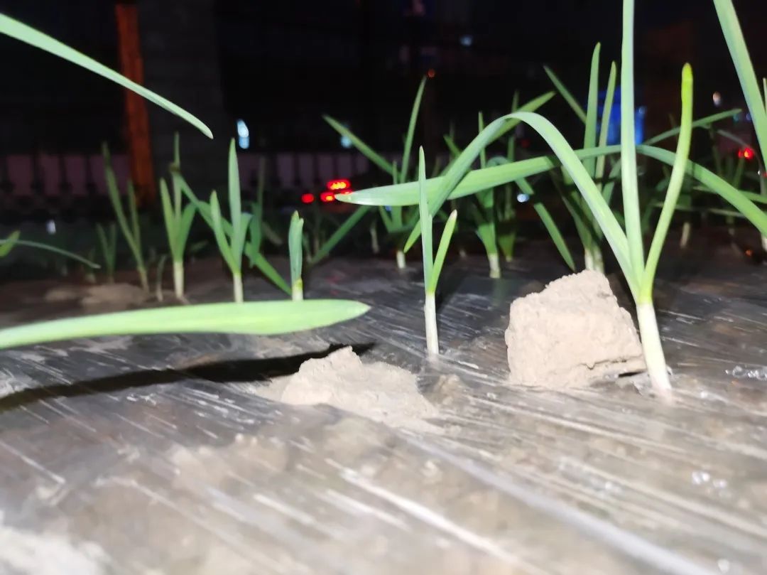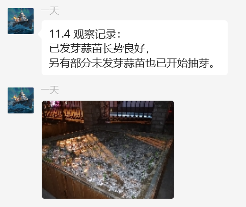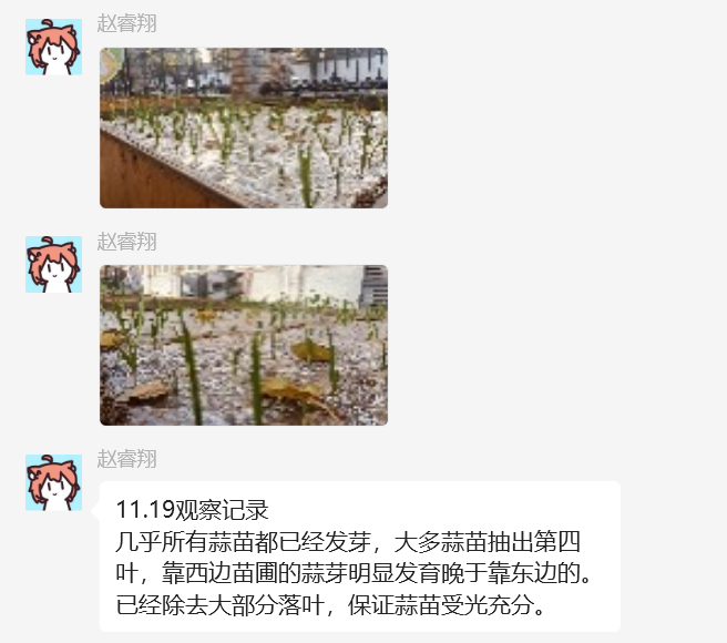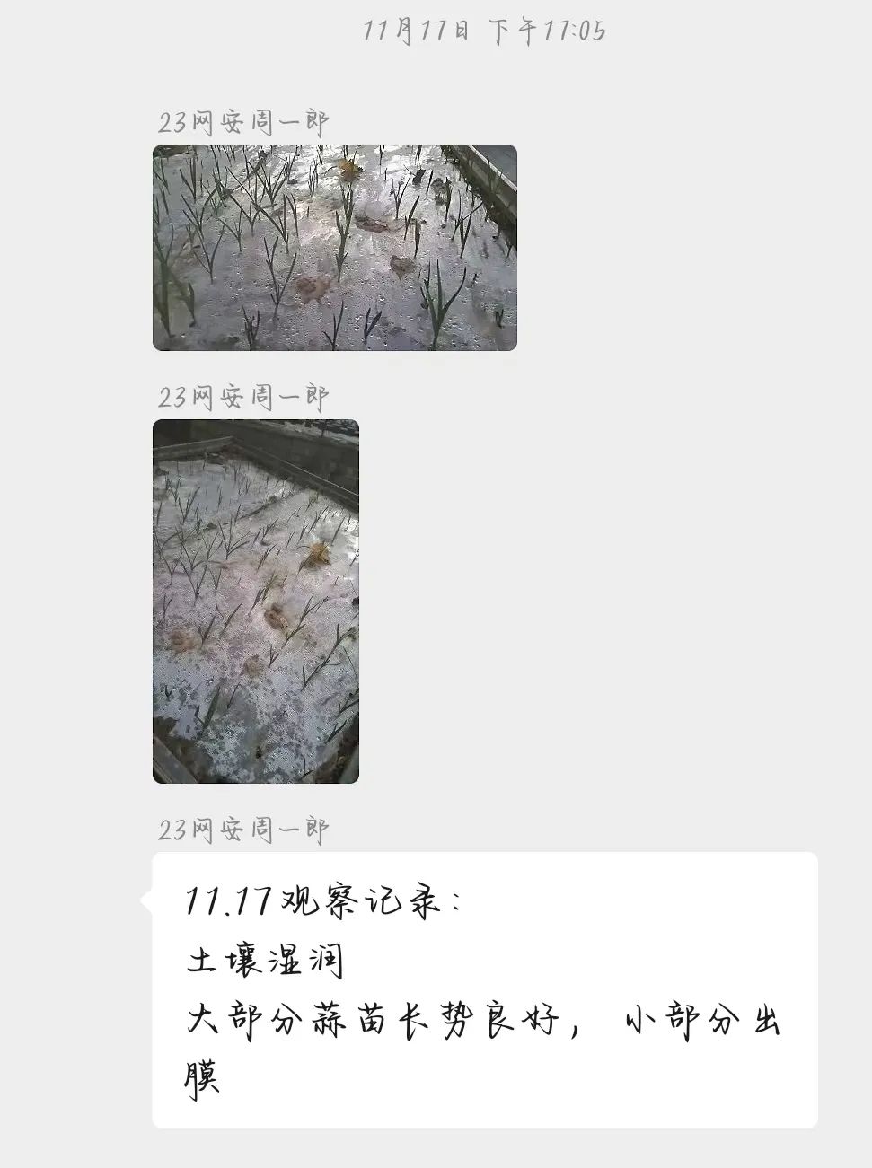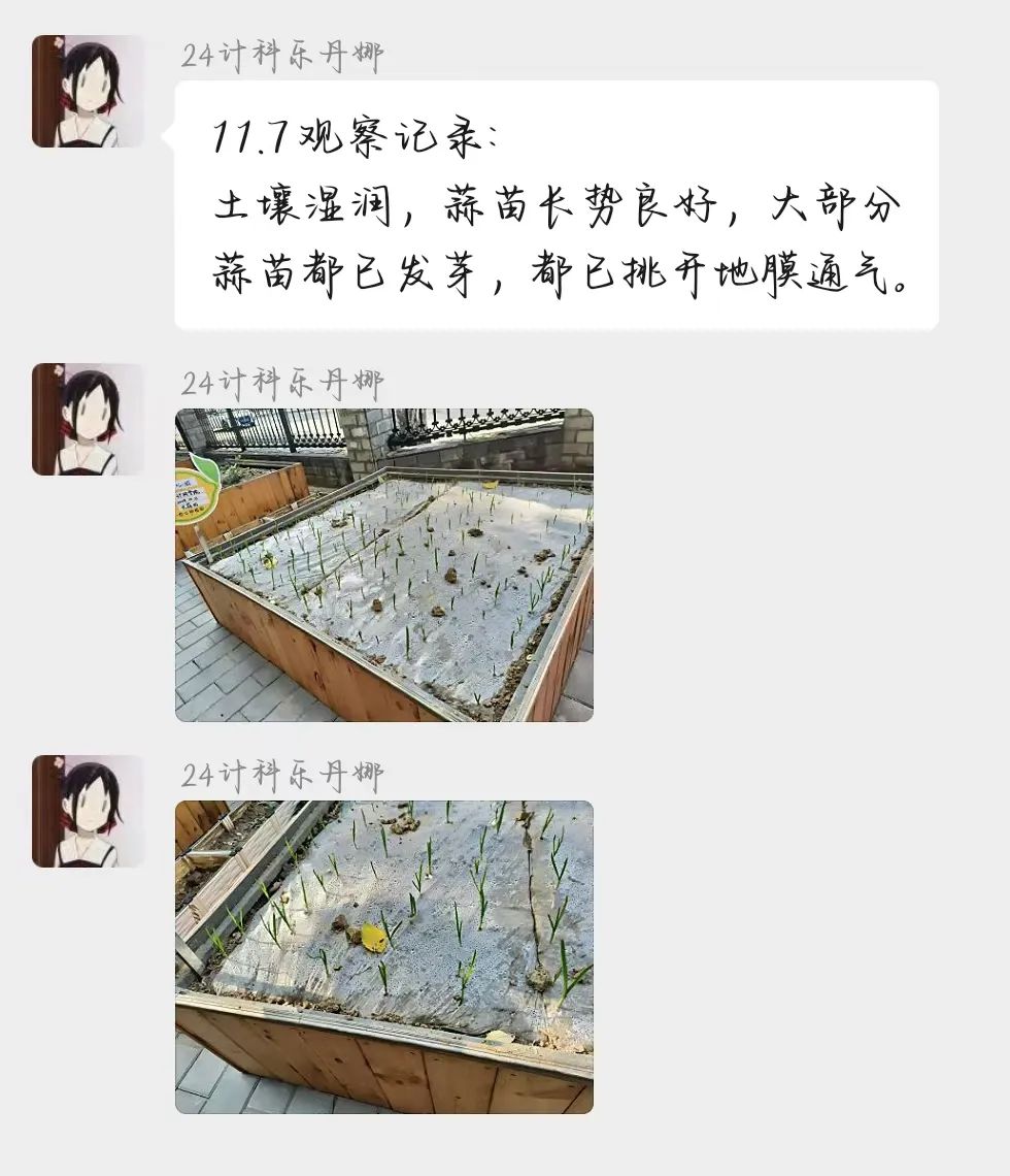在蒜苗抽芽萌发的十一月里,同学们积极记录蒜苗成长情况,进行挑开地膜等耕种工作。