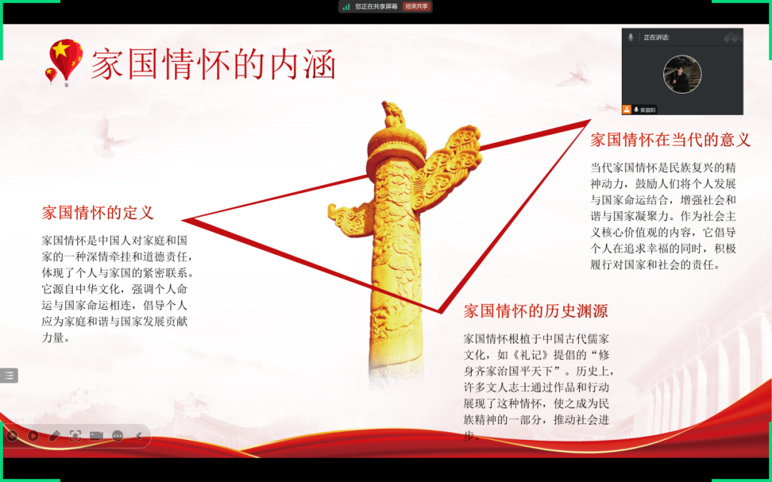 班会中的每一个环节都让我深思。它让我思考,作为新时代的青年,我该如何将这份家国情怀融入到自己的生活中。是的,我们或许平凡,但我们的行动可以不平凡。我们的每一次选择,每一次努力,都是对祖国最好的支持。