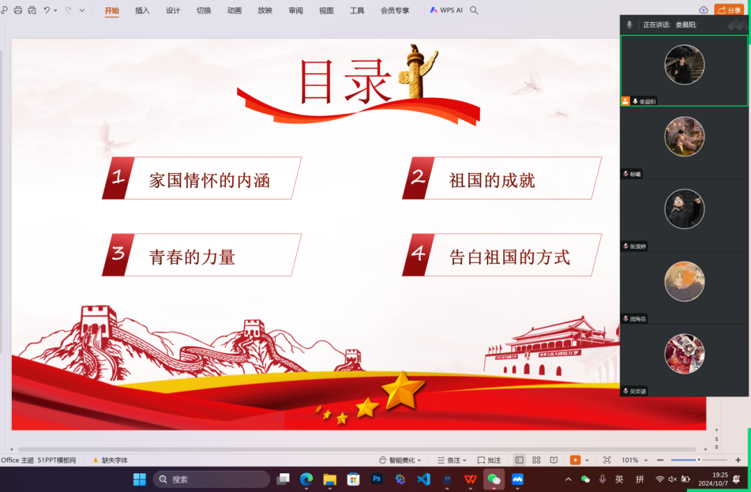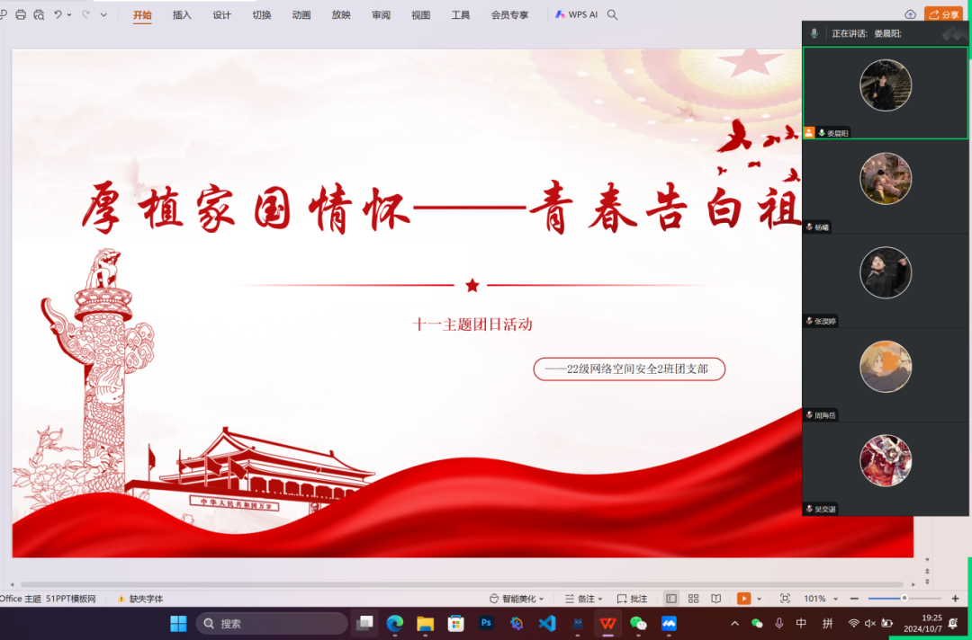 yl23455永利集团团委各基层团支部在国庆节开展主题团日活动,在这个风华正茂的时代,每一颗年轻的心都跳动着对未来的无限憧憬,每一份青春的热血都沸腾着对家国的深情厚谊。今天,22网安2班的同学们不仅踏上了一场心灵的旅程,更通过一场意义非凡的线上活动,让青春的誓言在虚拟与现实的交织中,向伟大的祖国深情告白——我爱你,中国!