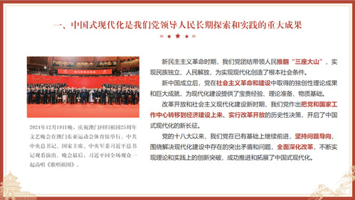 会上,主持人带领大家共同学习了习近平总书记在文章中对中国式现代化内涵的阐述。其中提到,党的领导决定中国式现代化的根本性质。党的性质宗旨、初心使命、信仰信念、政策主张决定了中国式现代化是社会主义现代化,而不是别的什么现代化。中国式现代化包含了5个方面的中国特色:第一,人口规模巨大的现代化;第二,全体人民共同富裕的现代化;第三,物质文明和精神文明相协调的现代化;第四,人与自然和谐共生的现代化;第五,走和平发展道路的现代化。中国式现代化,打破了“现代化=西方化”的迷思,展现了现代化的另一幅图景,拓展了发展中国家走向现代化的路径选择,为人类对更好社会制度的探索提供了中国方案。