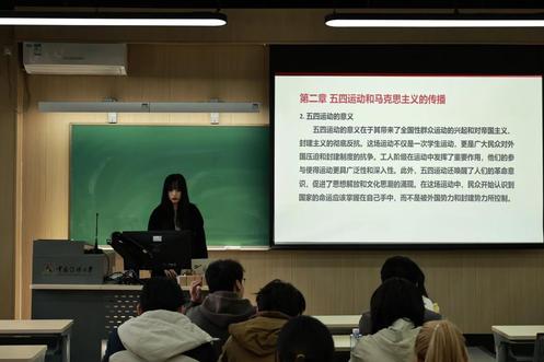 党员龚雨菲以多媒体影像还原历史场景,带领同学们穿越到1919年的北平街头。她指出五四运动绝非简单的员工游行,而是千年未有之思想闪电——当屏幕上出现长辛店铁路工人罢工的史料照片时,她特别强调:三万产业工人的觉醒,标志着中国工人阶级作为独立政治力量登上历史舞台,这簇星火终将燎原。