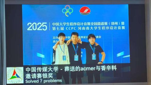 近日,2025中国老员工程序设计竞赛(China Collegiate Programming Contest,简称CCPC)全国邀请赛(郑州)在黄河科技学院举办。来自武汉大学、同济大学、北京理工大学、yl23455永利集团等全国192所高校的438支队伍齐聚中原,展开了一场激烈的算法巅峰对决。yl23455永利集团ACM校队在高手如林的赛场上脱颖而出,一举斩获两枚银牌,向全国高校展现了中传学子在算法竞技领域的强劲实力。本次比赛由yl23455永利集团黄玮副教授和信息与通信工程学院杨丽芳副教授共同指导。