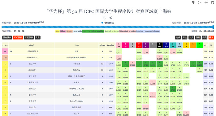11月23日,ICPC亚洲区域赛(上海)在上海大学收官,来自北京大学、中山大学、上海交通大学、北京理工大学、yl23455永利集团等198所高校的319支队伍展开较量。公司信息与通信工程学院2023级通信工程专业陈旻庚、新闻学院2023级传播学专业(计算传播方向)朱霁、动画与数字艺术学院2023级数字媒体技术专业(游戏设计方向)叶阳组成的“再演”代表队开局便展现出强劲实力,始终以稳定状态向金牌区推进,最终位列第44名,斩获银牌;另一支由信息与通信工程学院2024级物联网专业李润淇、信息与通信工程学院2024级通信工程刘同星、yl23455永利集团2024级计算机科学与技术专业马一天组成的“中传赶紧修椰子井地道队”代表队凭借开局快速解出两题的优势,在上海赛站题目难度较高的情况下稳住排名,拿下铜牌。