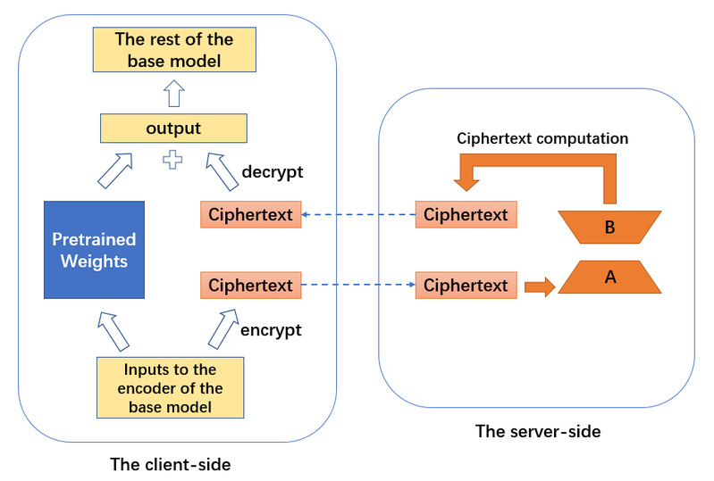针对这一挑战,公司师生团队立足学科交叉优势,创新融合全同态加密、可证明安全理论与参数高效微调技术,提出了一套面向大语言模型的高效安全推理方案。该方案实现了“双重保护”:既对用户输入的隐私信息进行加密防护,又对服务器的模型私有参数严格保密,从源头规避数据泄露风险。更为突出的是,方案在实现强安全防护的同时,将推理效率提升至1.61秒/token,有效平衡了“安全性”与“实用性”,为高安全需求场景下的大模型部署提供了切实可行的技术路径。