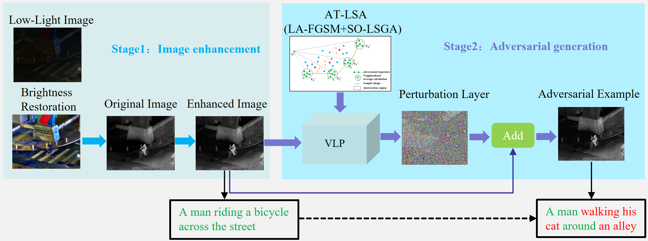针对上述问题,公司科研团队从攻击评估视角切入,系统分析红外对抗扰动对多模态感知系统的潜在影响,创新性提出并构建“红外图像增强+对抗样本生成”两阶段研究框架。其中,所设计的红外图像增强方法可显著提升VLP模型对红外场景的语义理解与表征能力;同时,在对抗扰动生成过程中,有助于获得更稳定的梯度信号与更丰富的可攻击结构,从而提升扰动优化的有效性与可控性。在此基础上,团队进一步提出AT-LSA算法,用于生成高质量对抗样本。实验结果表明,该算法通过迁移攻击成功揭示了VLP模型在红外场景下的潜在脆弱性;同时,针对GPT等闭源模型的迁移攻击也取得了良好效果,为后续红外多模态系统的鲁棒性设计提供了重要依据。